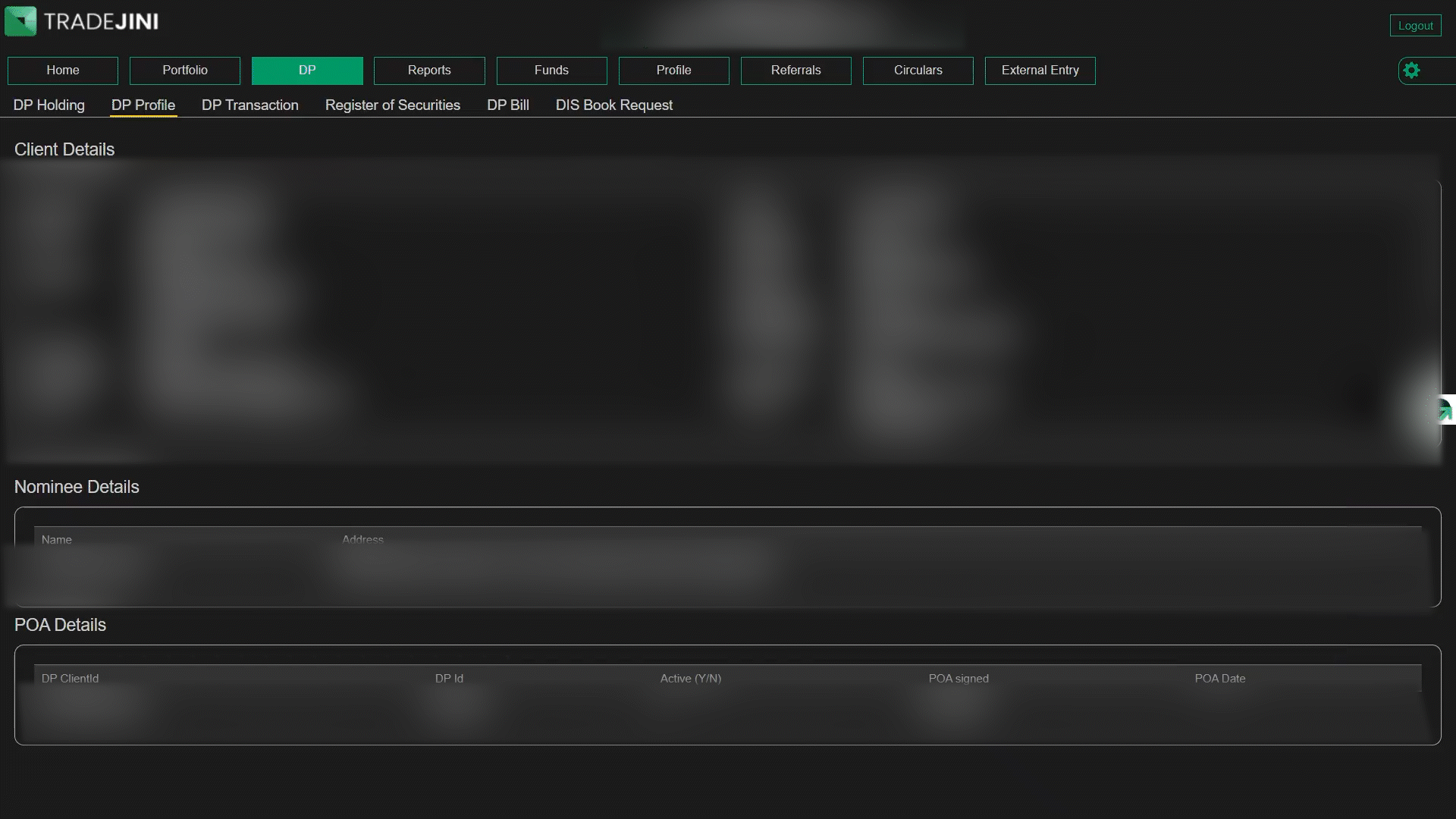 The DP Profile tab provides a comprehensive summary of the user's demat account information. This section is divided into three subcategories: Client Details, Nominee Details, and POA Details, offering traders detailed insights for effective account management.